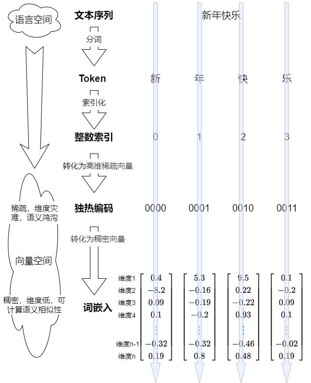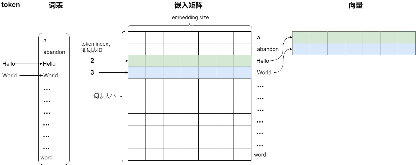 在Transformer中,把每个 Token(对应离散的输入数据,如单词或符号)映射到高维稠密向量空间的工作是由嵌入层(Embedding Layer)来实现的。输入嵌入层是Transformer框架中不可或缺的一部分,它的作用如下: