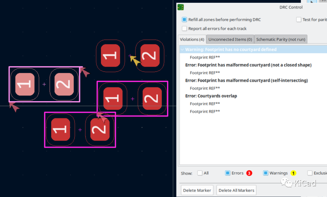 如果一个绘制Courtyard时不遵守这些规则,或者Courtyard存在其他问题,DRC会报错: