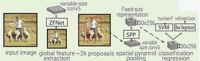 SPPNet用选择性搜索在每张图像中生成2000个区域(regionproposal)。然后使用ZFNet-Conv5从整幅图像中抓取一个共同的全体特征量。对于每个被生成的区域,SPPNet都使用spatialpyramidpooling(SPP)将该区域特征从全体特征量中pool出来,生成一个该区域的长度固定的表征。这个表征将被用于训练目标分类器和boxregressor。从全体特征量pooling特征,而不是像RNN那样将所有图像剪切(crops)全部输入一个完整的CNN,SPPNet让速度实现了2个数量级的提升。需要指出,尽管SPP运算是可微分的,但作者并没有那么做,因此ZFNet仅在ImageNet上训练,没有做finetuning。