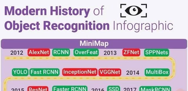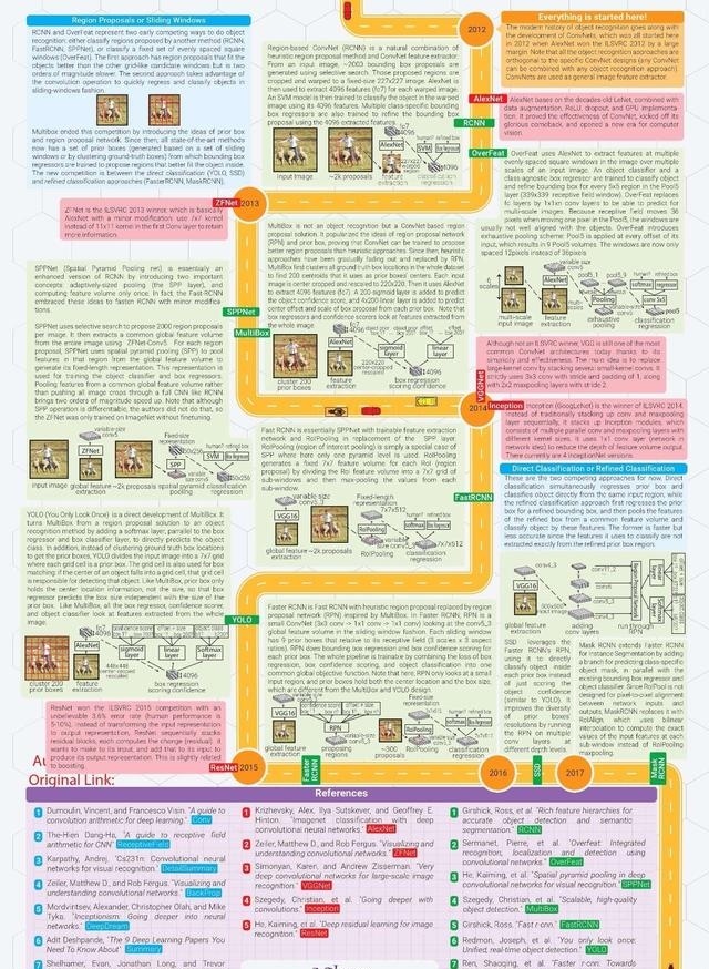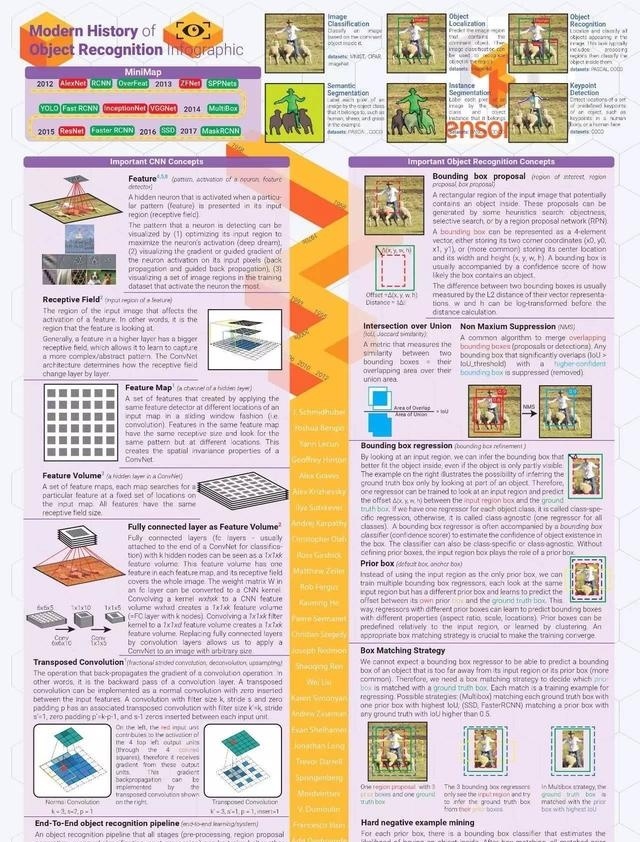 我感觉每当计算机视觉识别方面有什么惊人的突破发生了,都得有人再讲一遍是怎么回事。这就是我做这个图表的原因。它试图用最简洁的语言和最有吸引力的方式讲述物体识别的现代史。故事开始于2012年AlexNet赢得了ILSVRC(ImageNet大规模视觉识别挑战赛)。信息图由2页组成,第1页总结了重要的概念,第2页则勾画了历史。每一个图解都是重新设计的,以便更加一致和容易理解。所有参考文献都是精挑细选的,以便读者能够知道从哪里找到有关细节的解释。