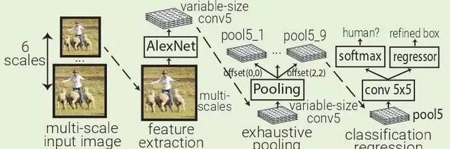 OverFeat:OverFeat使用AlexNet在一个输入图像的多个层次下的多个均匀间隔方形窗口中提取特征。训练一个对象分类器和一个类别不可知盒子回归器,用于对Pool5层(339x339接收域窗口)中每5x5区域的对象进行分类并对边界框进行细化。OverFeat将fc层替换为1x1xN的卷积层,以便能够预测多尺度图像。因为在Pool5中移动一个像素时,接受场移动36像素,所以窗口通常与对象不完全对齐。OverFeat引入了详尽的池化方案:Pool5应用于其输入的每个偏移量,这导致9个Pool5卷。窗口现在只有12像素而不是36像素。