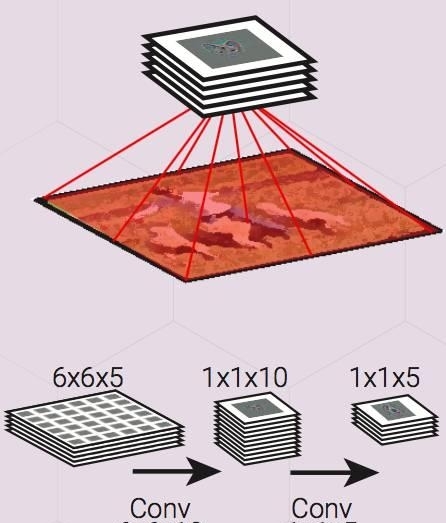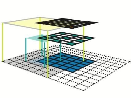 这是一组特征地图,每一张地图会在输入地图中的一些固定位置搜寻特定的特征。所有的特征的接受域大小都是一样的。