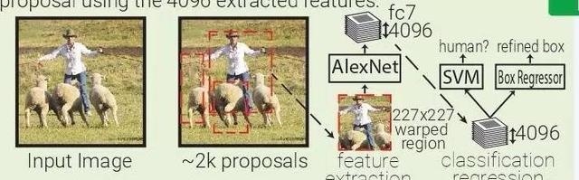 RCNN:基于区域的ConvNet(RCNN)是启发式区域提案法(heuristicregionproposalmethod)和ConvNet特征提取器的自然结合。从输入图像,使用选择性搜索生成约2000个边界框提案。这些被推出区域被裁剪并扭曲到固定大小的227x227图像。然后,AlexNet为每个弯曲图像提取4096个特征(fc7)。然后训练一个SVM模型,使用4096个特征对该变形图像中的对象进行分类。并使用4096个提取的特征来训练多个类别特定的边界框回归器来改进边界框。