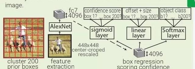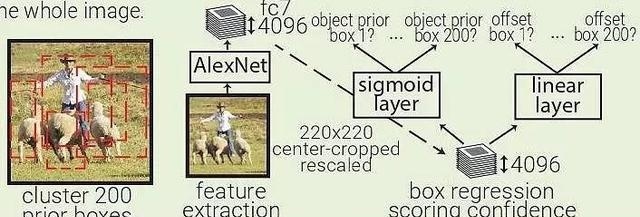 MultiBox:MultiBox不像是目标识别,更像是一种基于ConvNet的区域生成解决方案。MultiBox让区域生成网络(regionproposalnetwork,RPN)和priorbox的概念流行了起来,证明了卷积神经网络在训练后,可以生成比启发式方法更好的regionproposal。自此以后,启发式方法逐渐被RPN所取代。MultiBox首先将整个数据集中的所有真实boxlocation聚类,找出200个质心(centroid),然后用将其用于priorbox的中心。每幅输入的图像都会被从中心被裁减和重新调整大小,变为220×220。然后,MultiBox使用ALexNet提取4096个特征(fc7)。再加入一个200-sigmoid层预测目标置信度分数,另外还有一个4×200-linear层从每个priorbox预测centreoffset和boxproposal。注意下图中显示的boxregressors和置信度分数在看从整幅图像中抓取的特征。