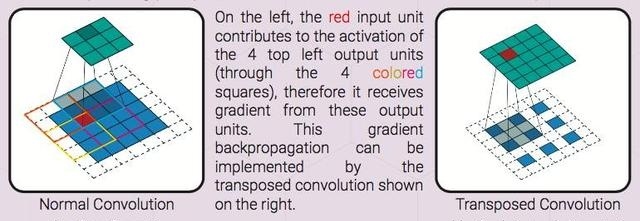这一操作对卷积中的梯度进行反向传播。换句话说,它是卷积层的反向传递。反向的卷积可以作为一个正常的卷积部署,并且在输入特征中不需要任何插入。