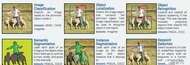 图像分类:根据图像的主要内容进行分类。数据集:MNIST,CIFAR,ImageNet物体定位:预测包含主要物体的图像区域,以便识别区域中的物体。数据集:ImageNet物体识别:定位并分类图像中出现的所有物体。这一过程通常包括:划出区域然后对其中的物体进行分类。数据集:PASCAL,COCO语义分割:把图像中的每一个像素分到其所属物体类别,在样例中如人类、绵羊和草地。数据集:PASCAL,COCO实例分割:把图像中的每一个像素分到其物体类别和所属物体实例。数据集:PASCAL,COCO关键点检测:检测物体上一组预定义关键点的位置,例如人体上或者人脸上的关键点。数据集:COCO