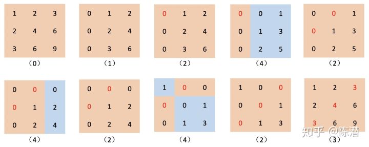 (3)重复第二步,直到找不出未被覆盖的0,这个时候把矩阵分成了ABCD四块,执行上图里的操作。