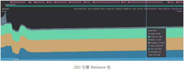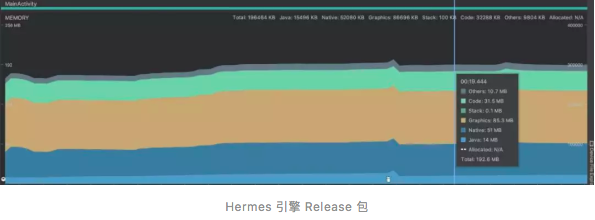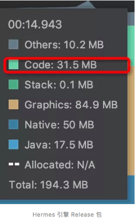 联系到上个章节中包大小分析中 libhermes.so 尺寸的减小,可以很容易想到,内存占用的减少就是因为 .so 对内存占用的减小。另外两者对 JavaScript 内存的占用也有细微差别,但是可以忽略不计。