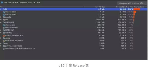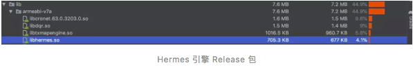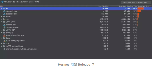 对比 lib 内容,发现大小差距主要是由 libjsc.so 和 libhermes.so 两者的差距导致的,即 Hermes 引擎的大小。