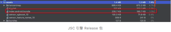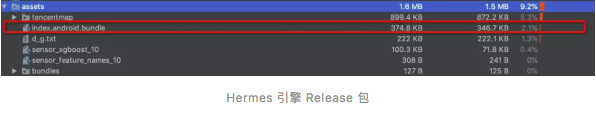 对比 assets 内容,发现大小变化主要由 index.android.bundle ,即 JavaScript 打包产物引起,Hermes 模式下反而更大的原因是进一步编译为二进制代码。