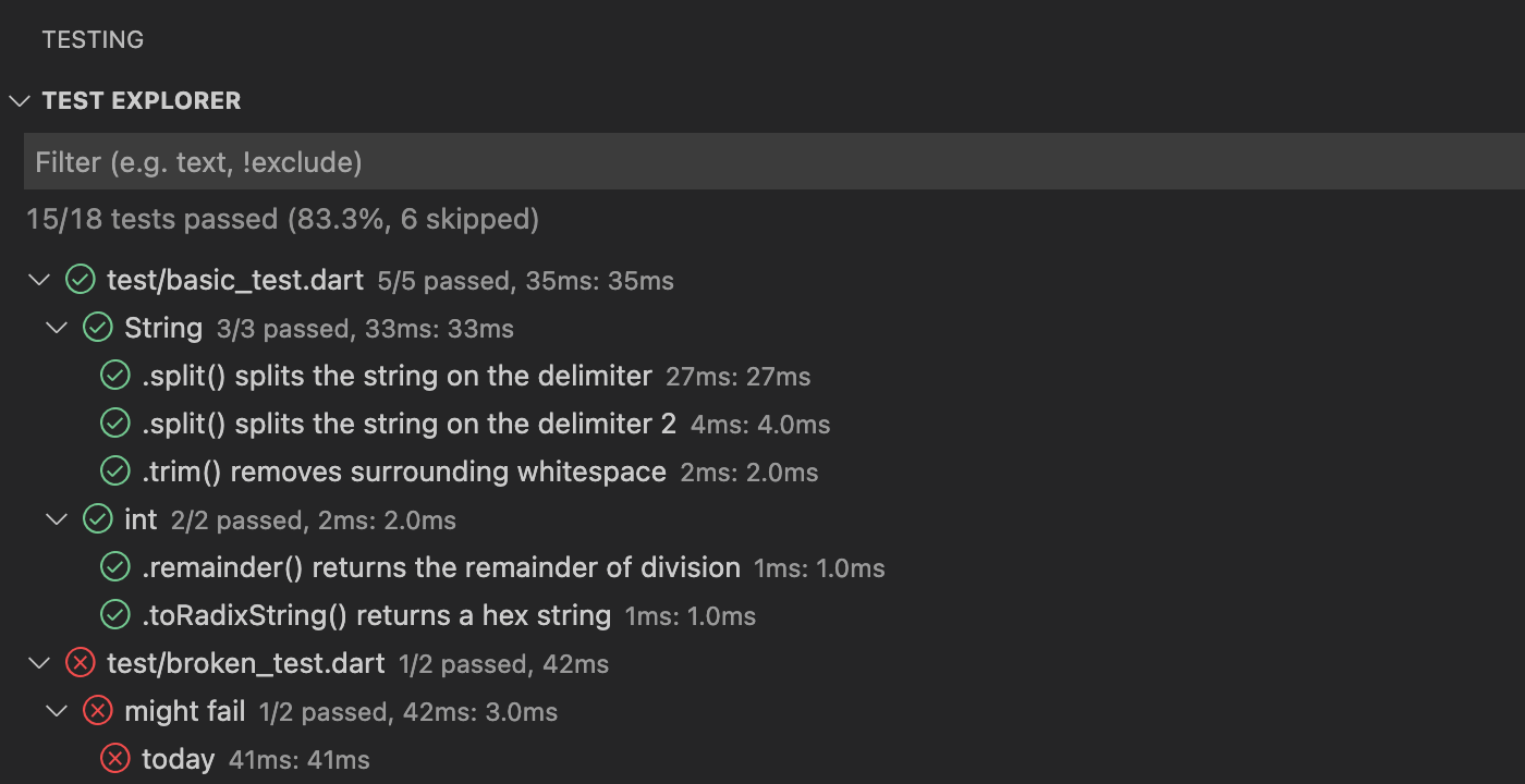又或者如果你想尝试一下预览功能,你可以启用 dart.previewVsCodeTestRunner 设置,看到 Dart 和 Flutter 测试通过新的 Visual Studio Code 测试运行器运行。
