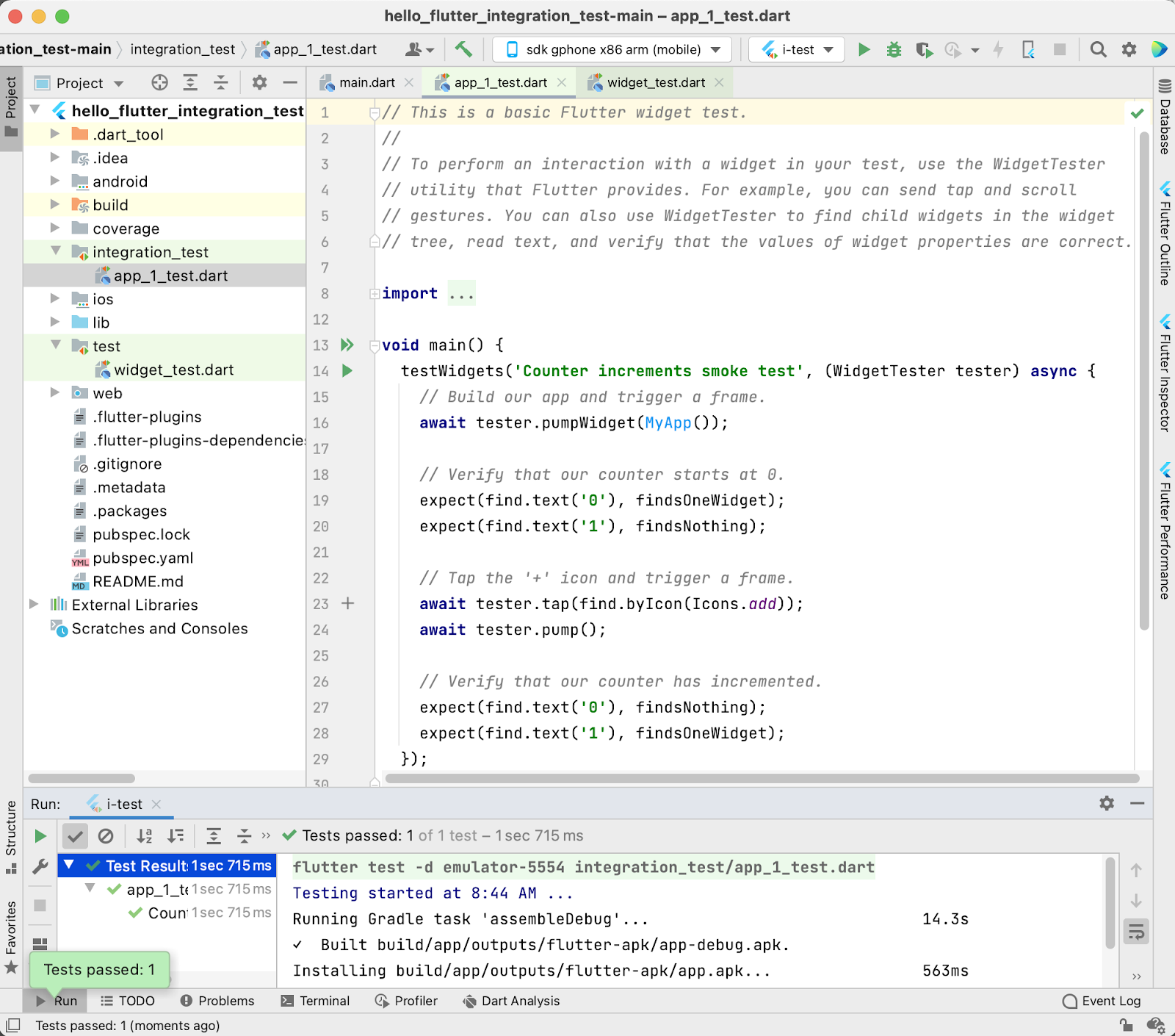IntelliJ / Android Studio 的 Flutter 插件在这个版本中也有一些改进,首先改进是运行集成测试的能力 (#5459)。集成测试是在设备上运行的整个应用测试,在 integration_test 目录下运行,并使用与 widget 单元测试相同的 testWidgets() 功能。