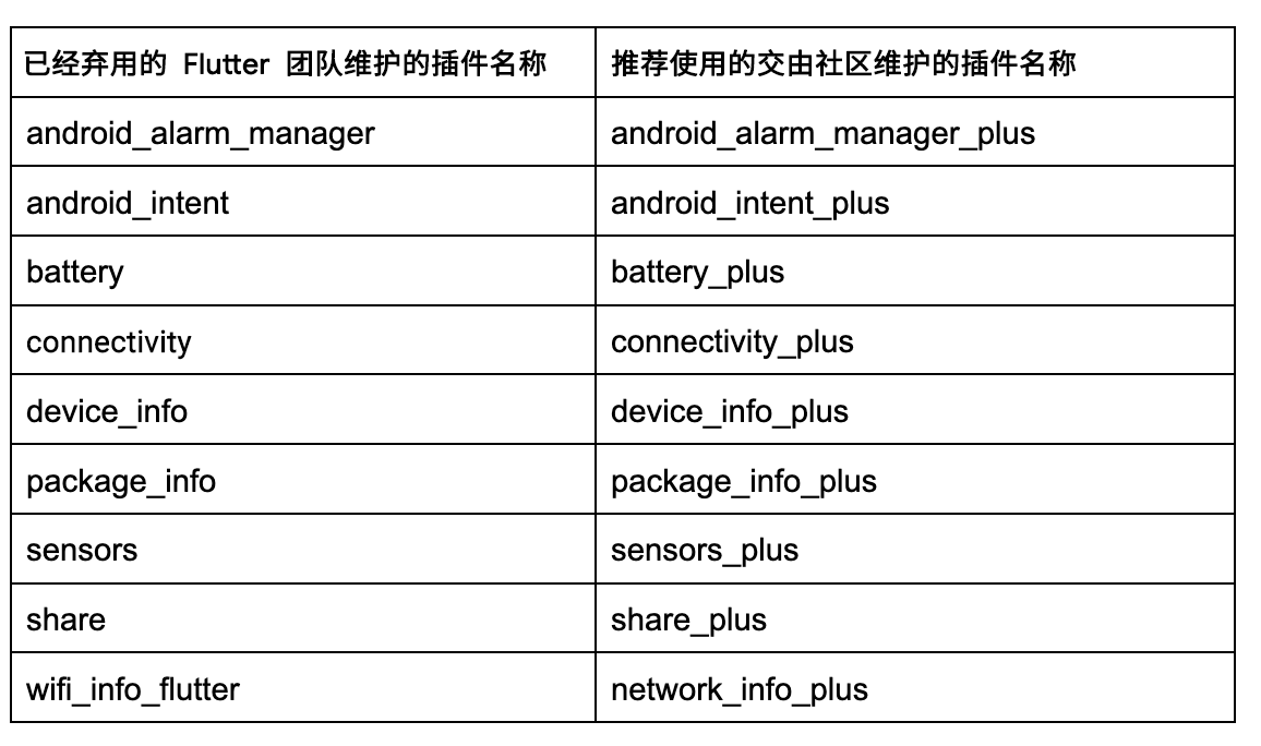 此外,由于这些插件不再积极维护,所以我们已取消了它们的 Flutter Favorite 标记。如果你还没有迁移到 plus 系列插件,我们建议你按照以下的表格进行对照迁移。