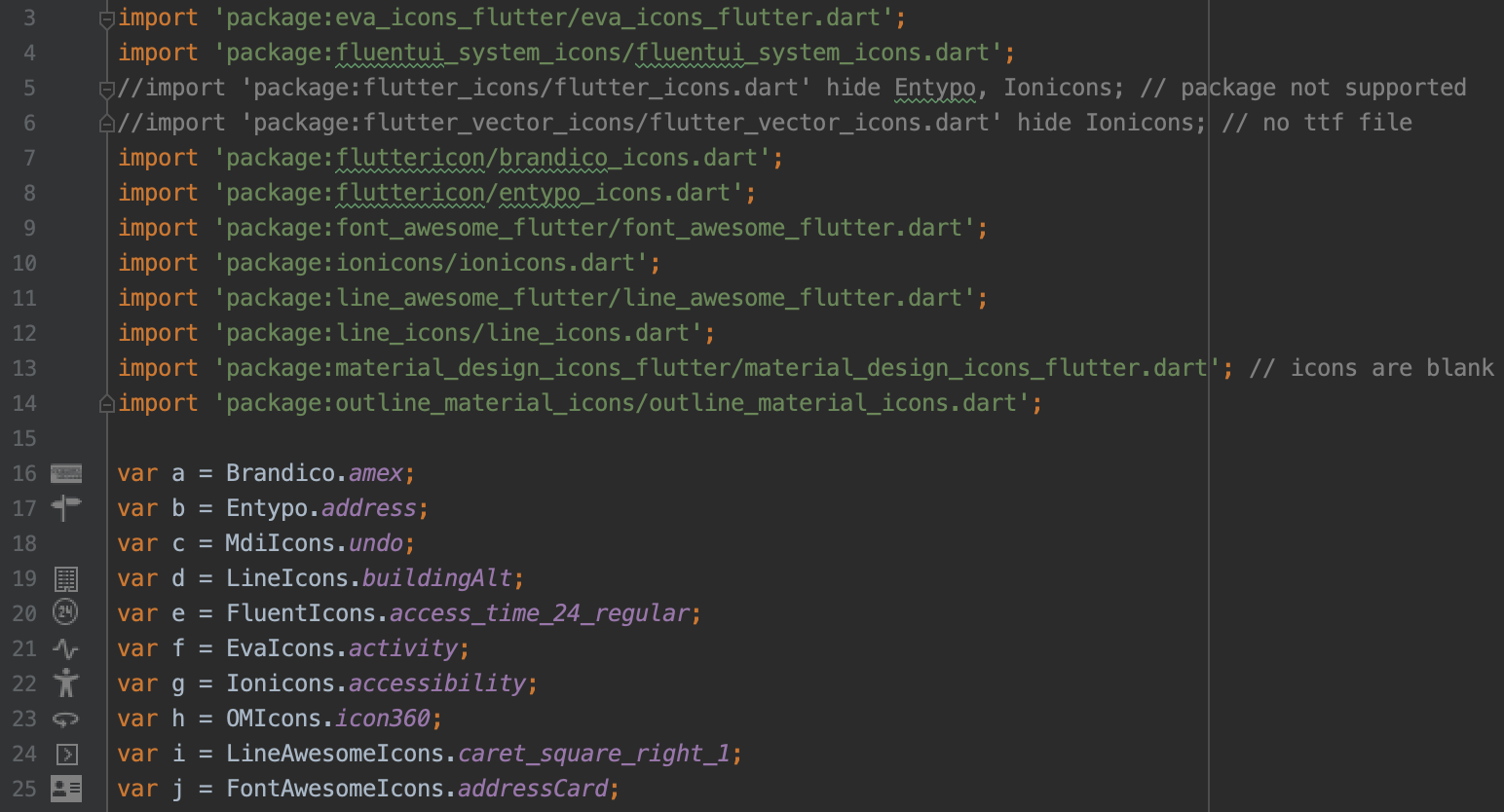 注意,这对定义为类中静态常量的图标有效,如屏幕截图中的示例代码所示。它不会对表达式起作用,例如 LineIcons.addressBook() 或 LineIcons.values['code']。如果你是一个图标 package 的作者,而这个图标 package 并不适合这个功能,请 创建一个 Issue 进行反馈。
