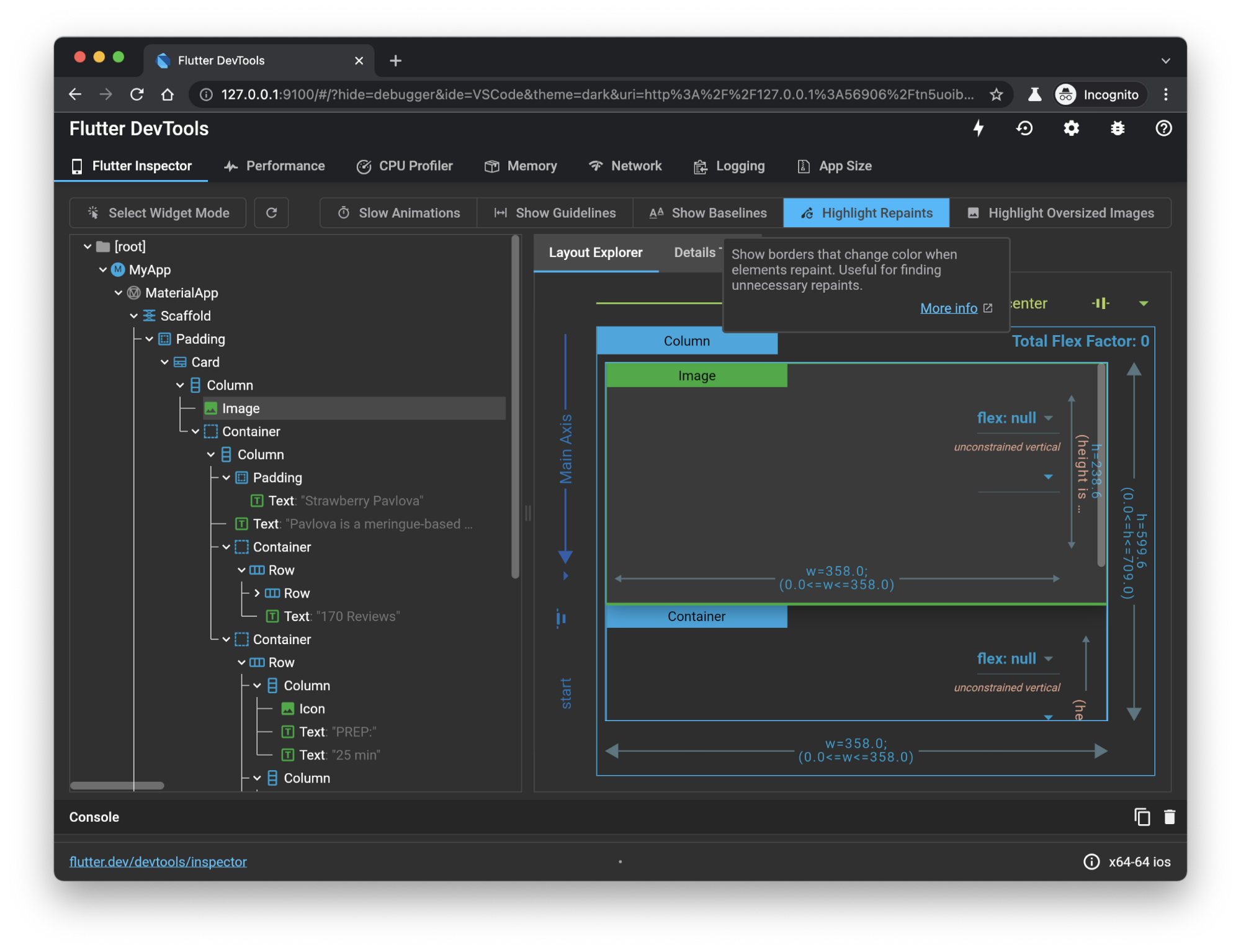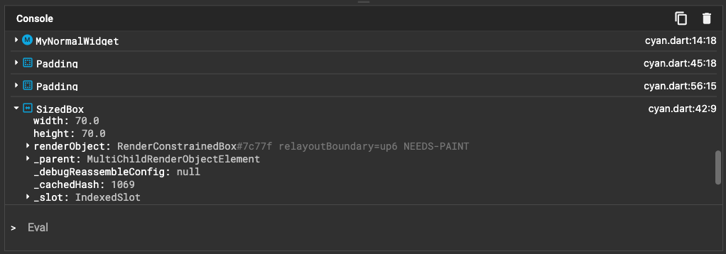 性能可能并不是你唯一想要调试的内容。新版本的 DevTools 带有对 Widget Inspector 的更新,当你将鼠标悬停在 widget 上时,可以评估对象、查看属性、widget 状态等等。