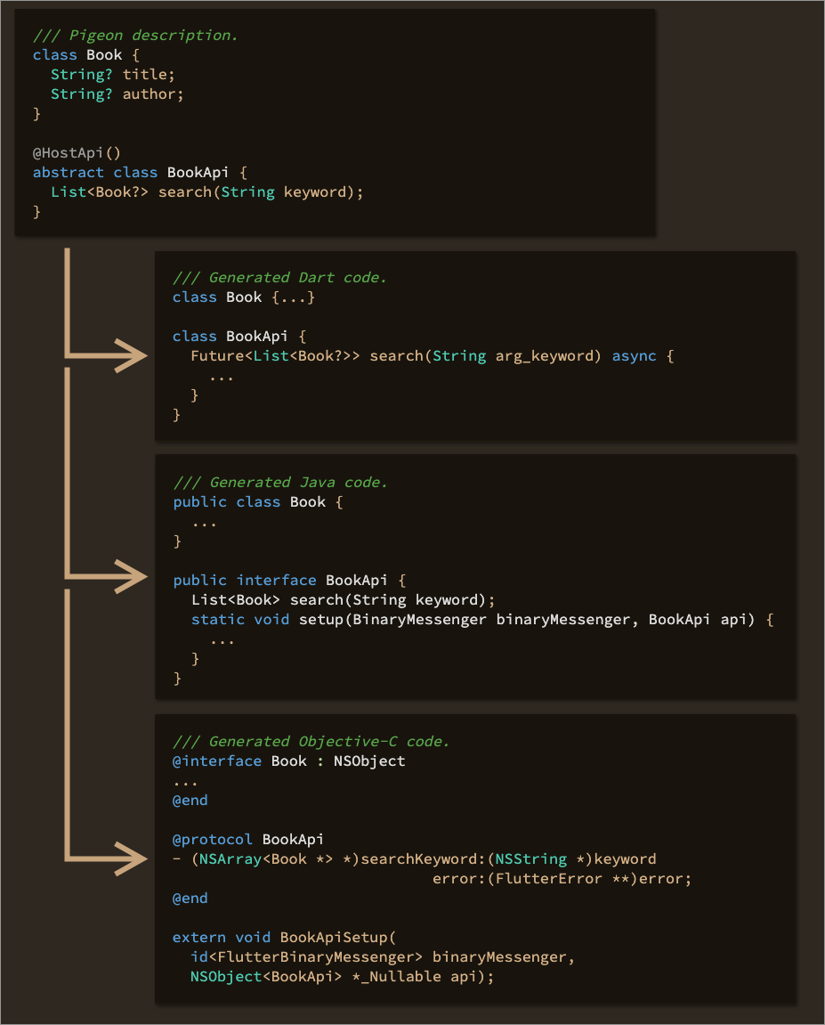 如果你正在开发一个插件而不是一个应用,你可能会对 Pigeon 1.0 版本感兴趣。Pigeon 是一个代码生成工具,用于生成 Flutter 和其宿主平台之间类型安全的交互代码。你可以定义插件的 API 描述,并为 Dart 与 Java / Objective-C / Kotlin / Swift 生成模板代码。