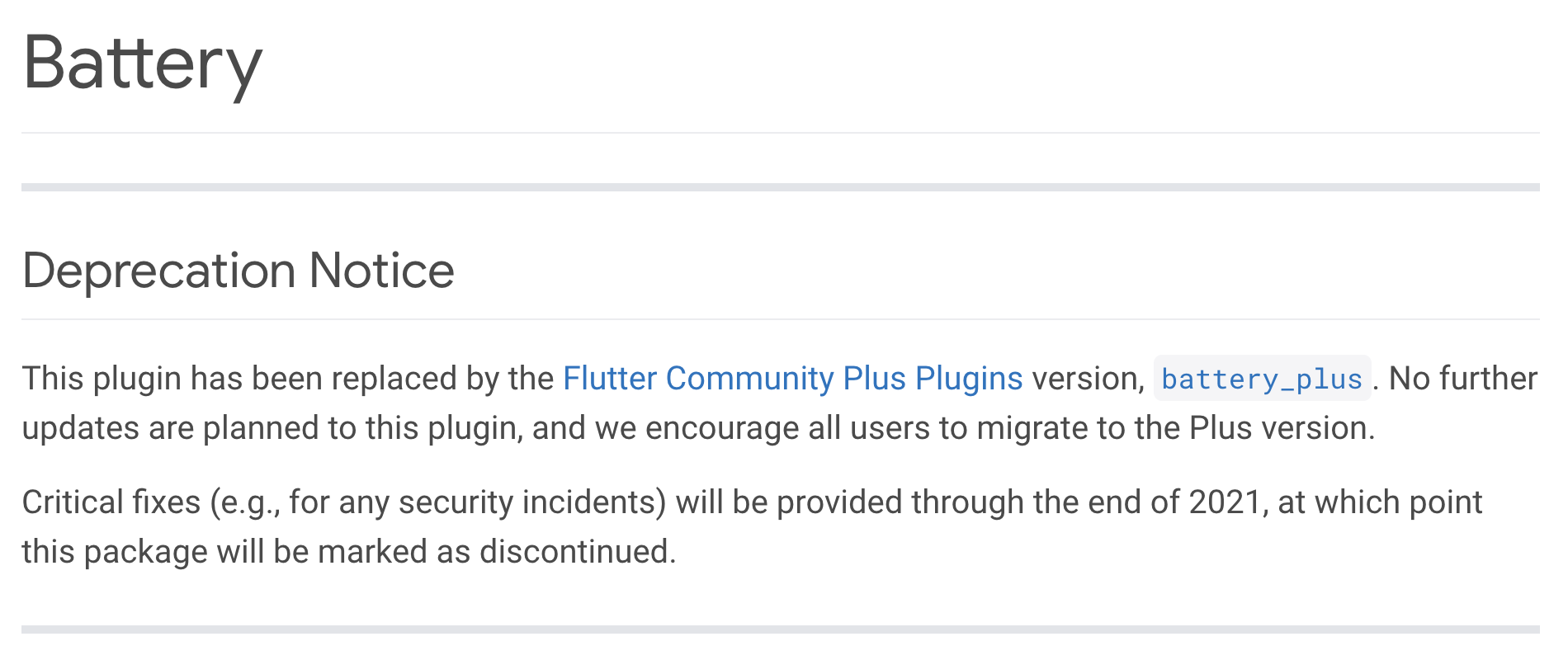 另一个有价值的社区贡献是由 fluttercommunity.dev 组织做出的,他们的代表作是 plus 系列插件。随着新的 Flutter 版本发布,之前由 Flutter 官方团队维护的插件现在 “交接” 给了 fluttercommunity.dev 组织,在每个插件下方都会有下面类似的提示: