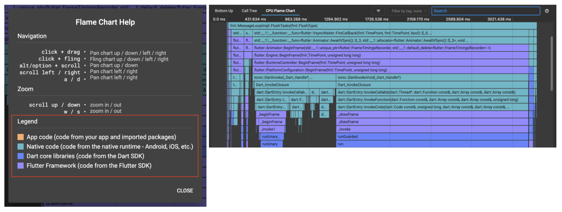 此外,当你追踪应用中的 CPU 性能问题时,可能已经淹没在了来自 Dart 和 Flutter 库或引擎的原生代码的剖析数据中。如果你想关闭这些数据以专注自己的代码,那么你可以使用新的 CPU Profiler 功能 (#3236),使你能够隐藏来自任何这些源的 Profiler 信息。