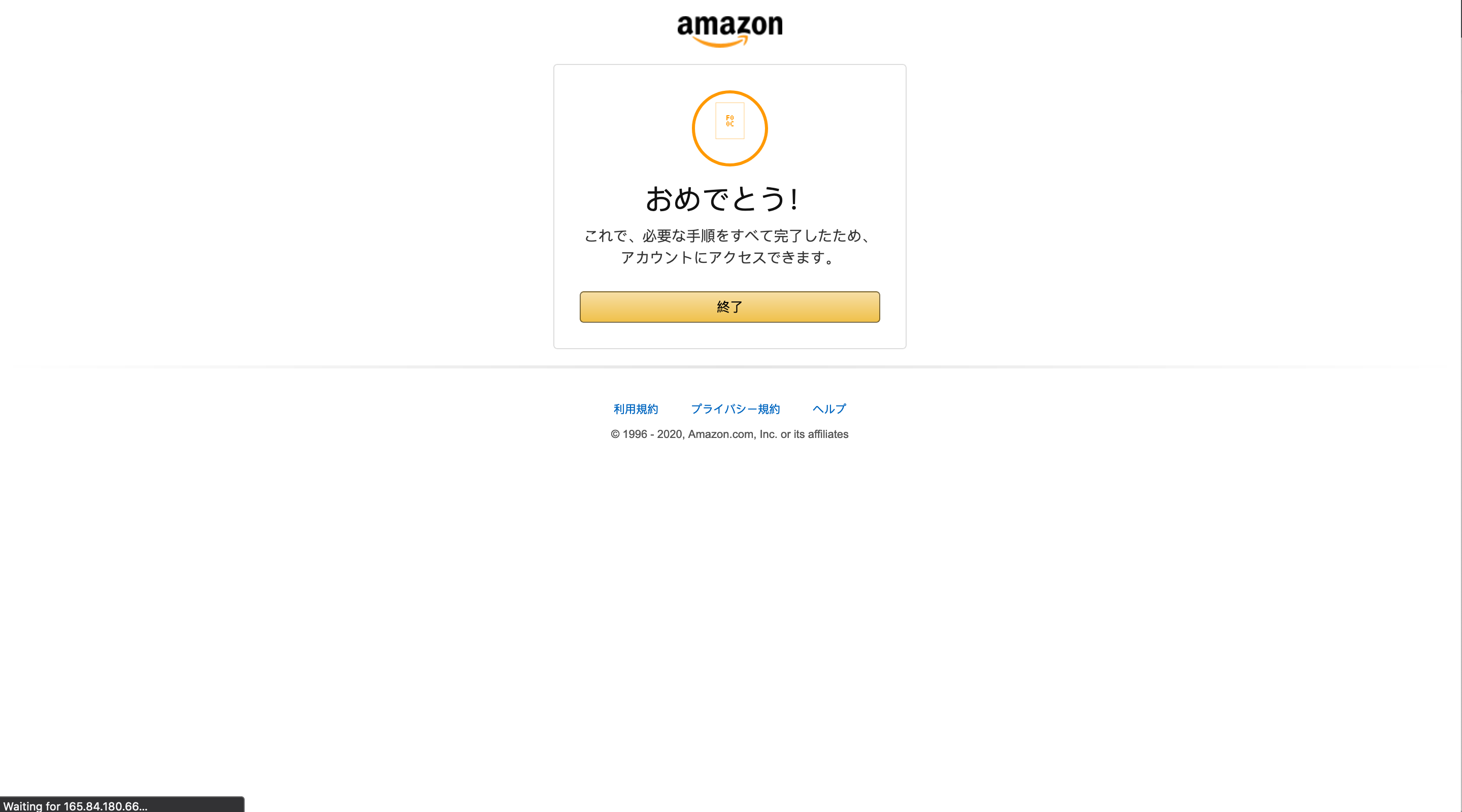 提交有效信息之后,研究人员感谢用户更新信息,告知他们现在可以访问其帐户,并重定向到真正的Amazon Japan网站Amazon .co[.]jp。