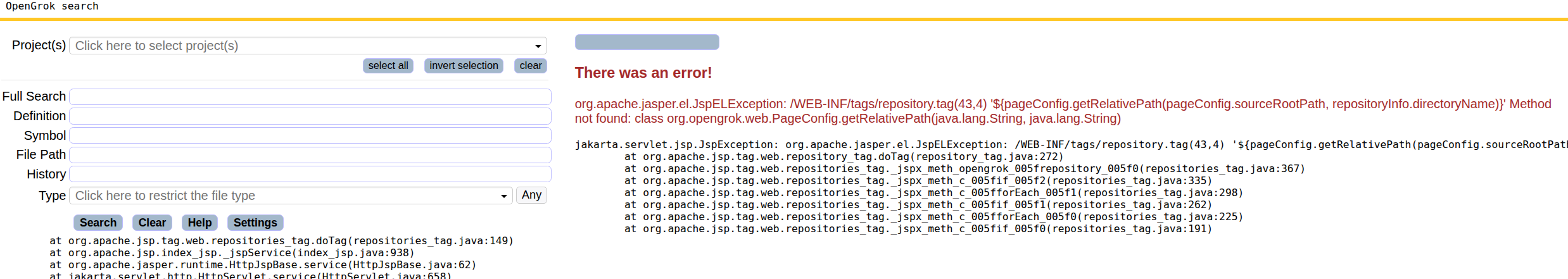 org.apache.jasper.el.JspELException: /WEB-INF/tags/repository.tag(43,4) '${pageConfig.getRelativePath(pageConfig.sourceRootPath, repositoryInfo.directoryName)}' Method not found: class org.opengrok.web.PageConfig.getRelativePath(java.lang.String, java.lang.String) jakarta.servlet.jsp.JspException: org.apache.jasper.el.JspELException: /WEB-INF/tags/repository.tag(43,4) '${pageConfig.getRelativePath(pageConfig.sourceRootPath, repositoryInfo.directoryName)}' Method not found: class org.opengrok.web.PageConfig.getRelativePath(java.lang.String, java.lang.String) at org.apache.jsp.tag.web.repository_tag.doTag(repository_tag.java:272) at org.apache.jsp.tag.web.repositories_tag._jspx_meth_opengrok_005frepository_005f0(repositories_tag.java:367) at org.apache.jsp.tag.web.repositories_tag._jspx_meth_c_005fif_005f2(repositories_tag.java:335) at org.apache.jsp.tag.web.repositories_tag._jspx_meth_c_005fforEach_005f1(repositories_tag.java:298) at org.apache.jsp.tag.web.repositories_tag._jspx_meth_c_005fif_005f1(repositories_tag.java:262) at org.apache.jsp.tag.web.repositories_tag._jspx_meth_c_005fforEach_005f0(repositories_tag.java:225) at org.apache.jsp.tag.web.repositories_tag._jspx_meth_c_005fif_005f0(repositories_tag.java:191) at org.apache.jsp.tag.web.repositories_tag.doTag(repositories_tag.java:149) at org.apache.jsp.index_jsp._jspService(index_jsp.java:938) at org.apache.jasper.runtime.HttpJspBase.service(HttpJspBase.java:62) at jakarta.servlet.http.HttpServlet.service(HttpServlet.java:658) at org.apache.jasper.servlet.JspServletWrapper.service(JspServletWrapper.java:428) at org.apache.jasper.servlet.JspServlet.serviceJspFile(JspServlet.java:350) at org.apache.jasper.servlet.JspServlet.service(JspServlet.java:301) at jakarta.servlet.http.HttpServlet.service(HttpServlet.java:658) at org.apache.catalina.core.ApplicationFilterChain.internalDoFilter(ApplicationFilterChain.java:193) at org.apache.catalina.core.ApplicationFilterChain.doFilter(ApplicationFilterChain.java:138) at org.apache.tomcat.websocket.server.WsFilter.doFilter(WsFilter.java:51) at org.apache.catalina.core.ApplicationFilterChain.internalDoFilter(ApplicationFilterChain.java:162) at org.apache.catalina.core.ApplicationFilterChain.doFilter(ApplicationFilterChain.java:138) at org.opengrok.web.CookieFilter.doFilter(CookieFilter.java:50) at org.apache.catalina.core.ApplicationFilterChain.internalDoFilter(ApplicationFilterChain.java:162) at org.apache.catalina.core.ApplicationFilterChain.doFilter(ApplicationFilterChain.java:138) at org.opengrok.web.AuthorizationFilter.doFilter(AuthorizationFilter.java:100) at org.apache.catalina.core.ApplicationFilterChain.internalDoFilter(ApplicationFilterChain.java:162) at org.apache.catalina.core.ApplicationFilterChain.doFilter(ApplicationFilterChain.java:138) at org.opengrok.web.StatisticsFilter.doFilter(StatisticsFilter.java:69) at org.apache.catalina.core.ApplicationFilterChain.internalDoFilter(ApplicationFilterChain.java:162) at org.apache.catalina.core.ApplicationFilterChain.doFilter(ApplicationFilterChain.java:138) at org.apache.catalina.core.StandardWrapperValve.invoke(StandardWrapperValve.java:165) at org.apache.catalina.core.StandardContextValve.invoke(StandardContextValve.java:88) at org.apache.catalina.authenticator.AuthenticatorBase.invoke(AuthenticatorBase.java:482) at org.apache.catalina.core.StandardHostValve.invoke(StandardHostValve.java:113) at org.apache.catalina.valves.ErrorReportValve.invoke(ErrorReportValve.java:83) at org.apache.catalina.core.StandardEngineValve.invoke(StandardEngineValve.java:72) at org.apache.catalina.connector.CoyoteAdapter.service(CoyoteAdapter.java:342) at org.apache.coyote.http11.Http11Processor.service(Http11Processor.java:399) at org.apache.coyote.AbstractProcessorLight.process(AbstractProcessorLight.java:63) at org.apache.coyote.AbstractProtocol$ConnectionHandler.process(AbstractProtocol.java:903) at org.apache.tomcat.util.net.NioEndpoint$SocketProcessor.doRun(NioEndpoint.java:1774) at org.apache.tomcat.util.net.SocketProcessorBase.run(SocketProcessorBase.java:52) at org.apache.tomcat.util.threads.ThreadPoolExecutor.runWorker(ThreadPoolExecutor.java:973) at org.apache.tomcat.util.threads.ThreadPoolExecutor$Worker.run(ThreadPoolExecutor.java:491) at org.apache.tomcat.util.threads.TaskThread$WrappingRunnable.run(TaskThread.java:63) at java.base/java.lang.Thread.run(Thread.java:1583) Caused by: org.apache.jasper.el.JspELException: /WEB-INF/tags/repository.tag(43,4) '${pageConfig.getRelativePath(pageConfig.sourceRootPath, repositoryInfo.directoryName)}' Method not found: class org.opengrok.web.PageConfig.getRelativePath(java.lang.String, java.lang.String) at org.apache.jasper.el.JspValueExpression.getValue(JspValueExpression.java:134) at org.apache.jsp.tag.web.repository_tag._jspx_meth_c_005fset_005f6(repository_tag.java:426) at org.apache.jsp.tag.web.repository_tag._jspx_meth_c_005fif_005f0(repository_tag.java:402) at org.apache.jsp.tag.web.repository_tag.doTag(repository_tag.java:211) ... 44 more |