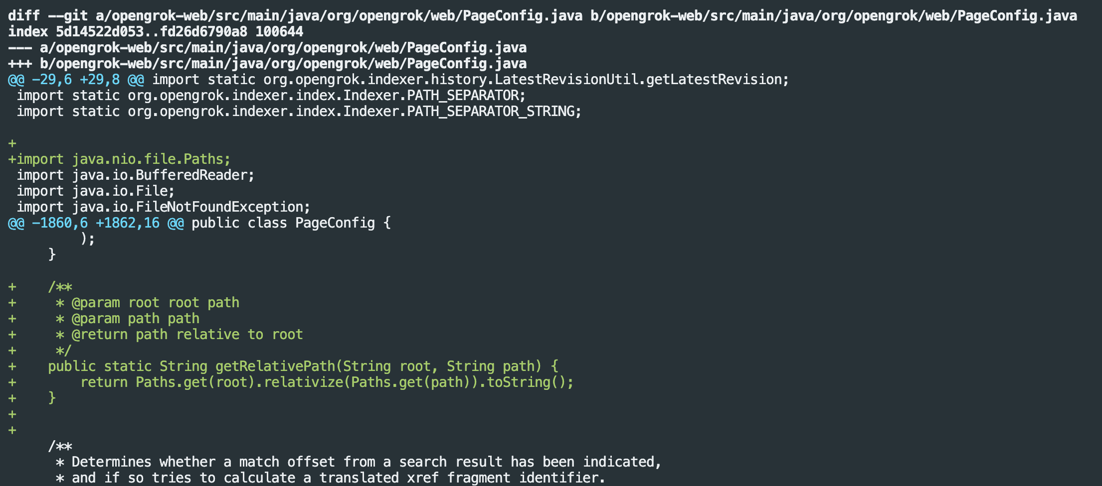 diff --git a/opengrok-web/src/main/java/org/opengrok/web/PageConfig.java b/opengrok-web/src/main/java/org/opengrok/web/PageConfig.java index 5d14522d053..fd26d6790a8 100644 --- a/opengrok-web/src/main/java/org/opengrok/web/PageConfig.java +++ b/opengrok-web/src/main/java/org/opengrok/web/PageConfig.java @@ -29,6 +29,8 @@ import static org.opengrok.indexer.history.LatestRevisionUtil.getLatestRevision; import static org.opengrok.indexer.index.Indexer.PATH_SEPARATOR; import static org.opengrok.indexer.index.Indexer.PATH_SEPARATOR_STRING; + +import java.nio.file.Paths; import java.io.BufferedReader; import java.io.File; import java.io.FileNotFoundException; @@ -1860,6 +1862,16 @@ public class PageConfig { ); } + /** + * @param root root path + * @param path path + * @return path relative to root + */ + public static String getRelativePath(String root, String path) { + return Paths.get(root).relativize(Paths.get(path)).toString(); + } + + /** * Determines whether a match offset from a search result has been indicated, * and if so tries to calculate a translated xref fragment identifier. |