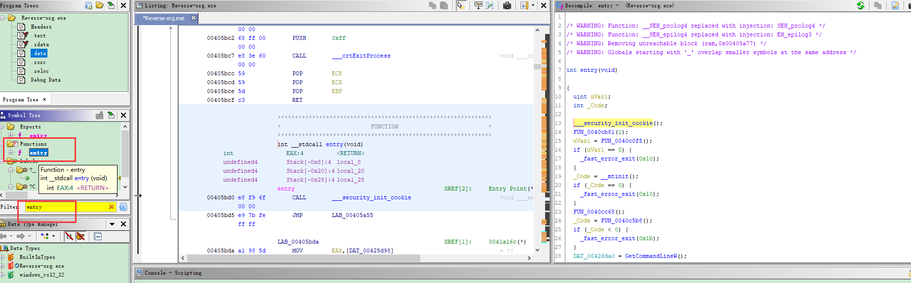 那怎么找到main函数呢 我们可以找到左边的functions,找到entry(当然有些程序直接有main,或者_start等关键字)