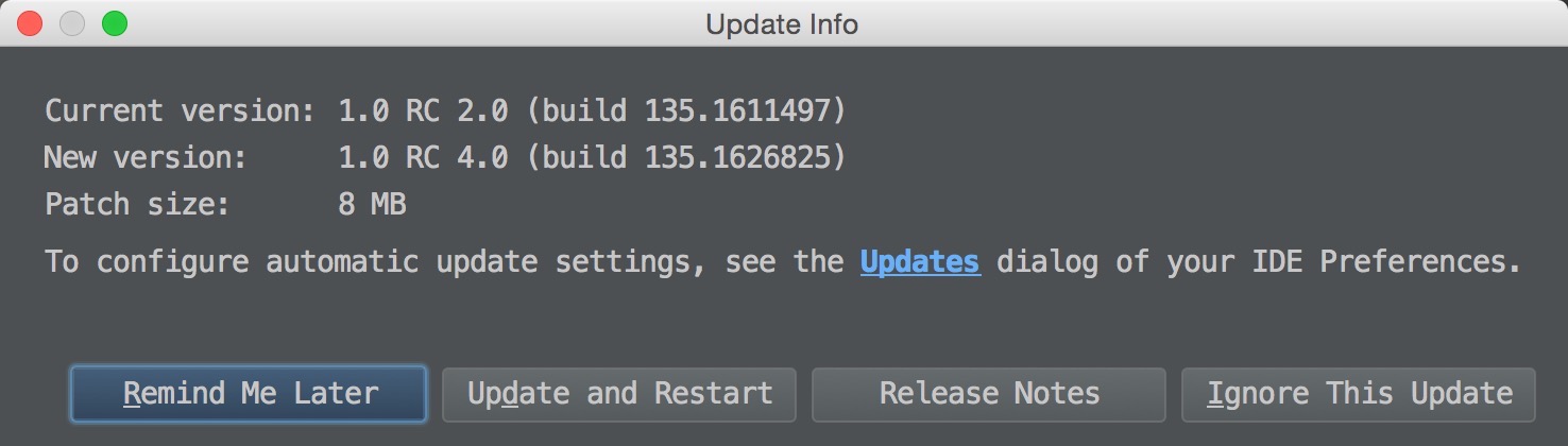 保存后,重新打开Android Studio点击Check Update就会弹出更新信息提示了
