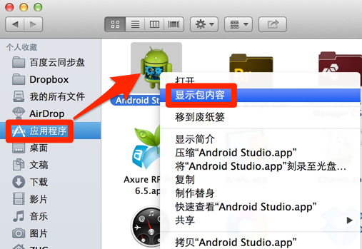 首先打开Finder在左边选择Application目录,在右边找到Android Studio.app,然后右击选择“显示包内容”如下图: