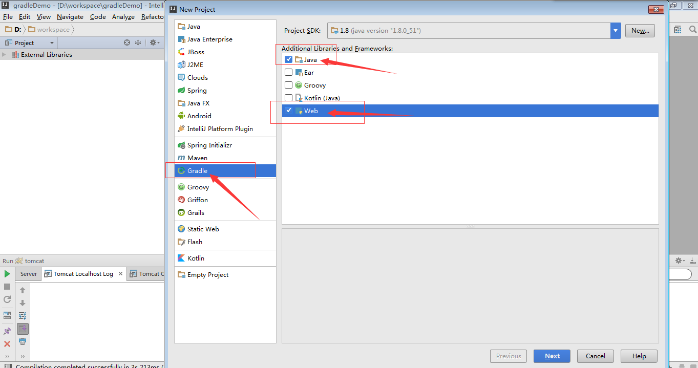 2.如下图,完成第一步后,会弹出这样一个窗体,然后在左边栏目找到Gradle,然后在右边勾选Java和Web两个选项,最后点击Next。