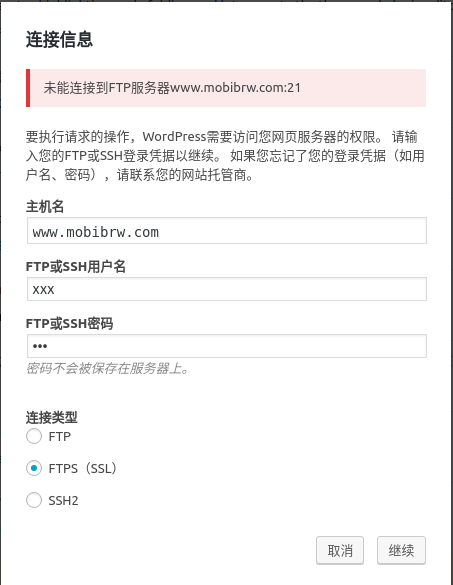 最近WordPress更新到最新版本之后,更新插件的时候提示如下图所示的错误信息(以前一直使用FTPS更新插件):