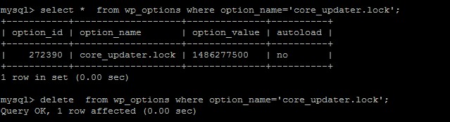 $ mysql -u root -p $ mysql> use wordpress; $ mysql> select * from wp_options where option_name='core_updater.lock'; $ mysql> delete from wp_options where option_name='core_updater.lock'; $ mysql> exit; |